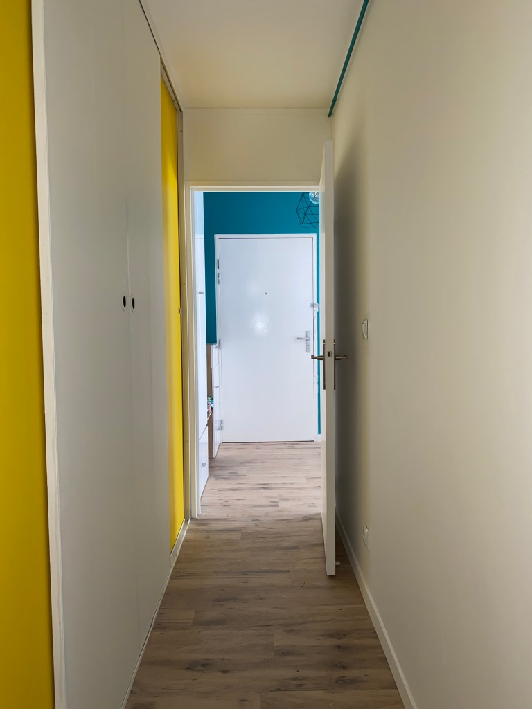 En quittant la pièce de vie, nous traversons un couloir au couleur ensoleillé avec un jaune vif.