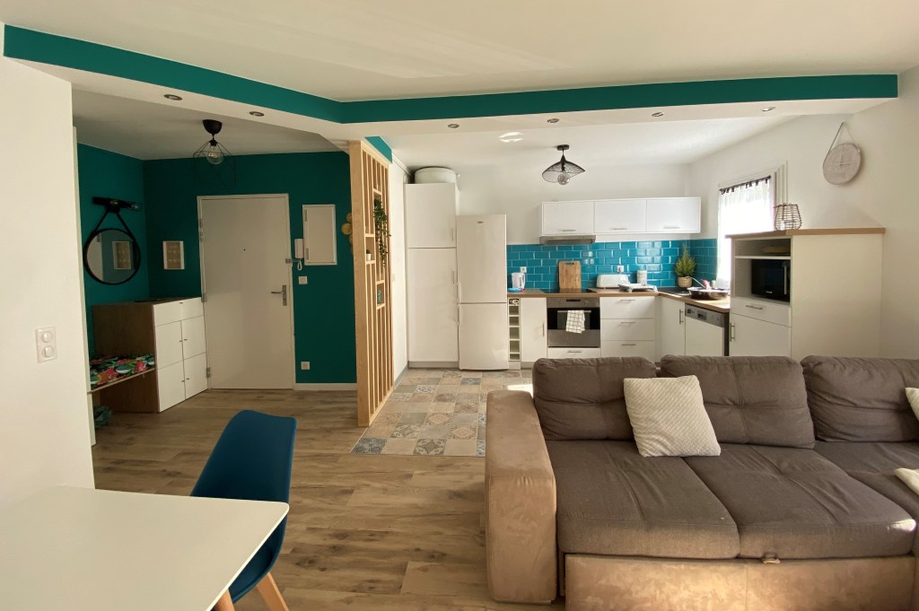 Dans le salon, nous sommes restés sur le blanc pour que n’importe qui puisse apporter sa touche de personnalité avec des objets de décoration ou encore un papier peint si cela lui plait. Cependant pour la cuisine, le mur du fond est en bleu rappelant l’entrée et les poutres apparentes de la même couleur.