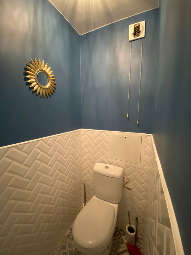 La salle de bain est toute de beige vêtue tandis que les toilettes sont teintées d’un bleu profond . De plus, on retrouve le même carrelage que celui de la cuisine créant un rappel de symbole entre les 2 pièces et donc une cohésion parfaite dans l’appartement.