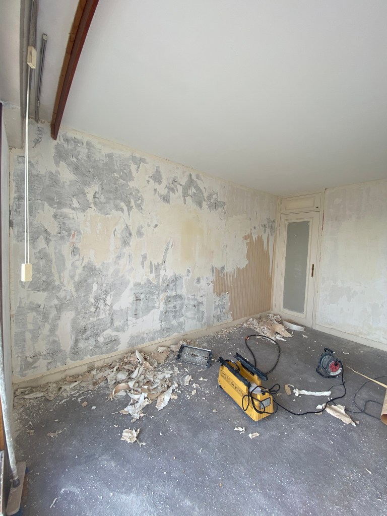 De plus, le papier peint a été retiré faisant place à de la peinture blanche soulignant l’agrandissement de la pièce.