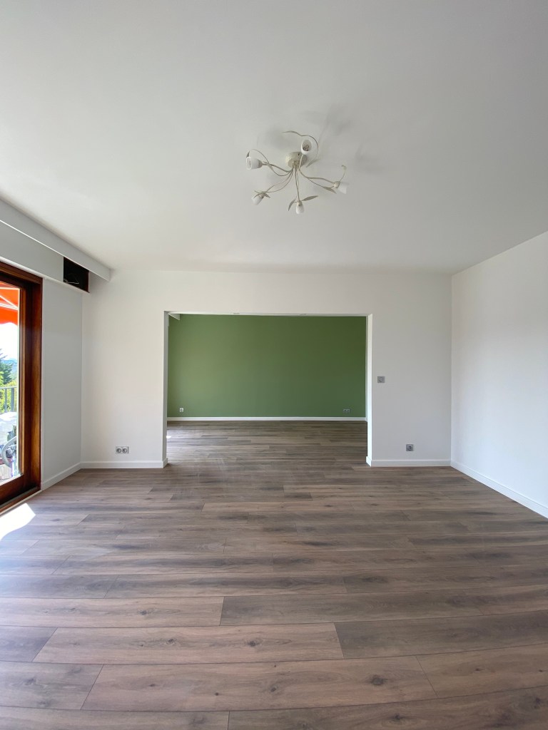 Concernant la pièce de vie, un parquet a également été posé et les murs repeints en blanc avec une touche de vert, couleur choisi par le client.