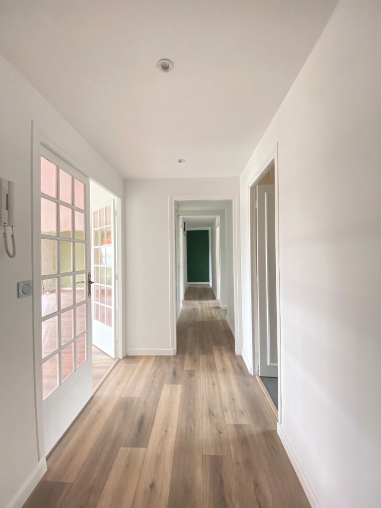 La moquette donnant un effet vieillot a été remplacé par du parquet de couleur assez clair. Cela provoque un effet de continuité dans cette entrée rendant l’espace directement plus grand.