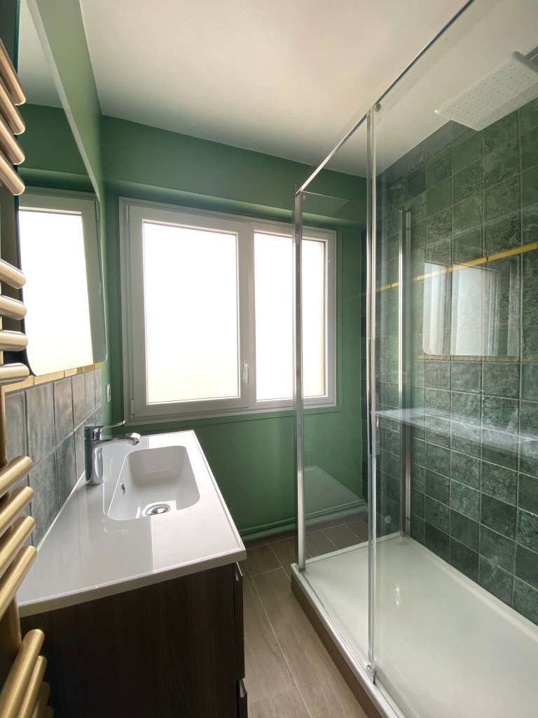 Notre équipe a réalisé dans cet appartement des travaux de tous types : curage, électricité refaite à neuve du tableau aux appareillages en encastrés sur des murs en béton, plomberie, enduits, faux plafond, sol en parquet et en carrelage et peinture. La démolition d’une baignoire pour y intégrer à la place une douche et la reprise complète de la cuisine.