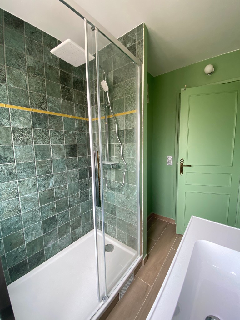 Le carrelage vert s’implante parfaitement dans cette pièce apportant un effet « Hammam », chaleureux et surtout coloré à la pièce.